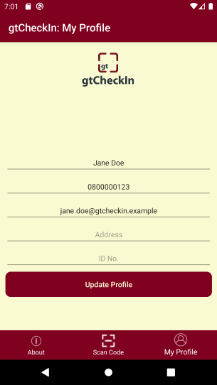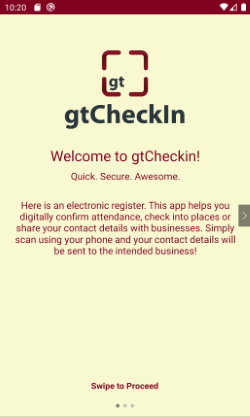 Registration and Checking-in made easy with gtCheckIn. This app helps you digitally confirm attendance or check into places or businesses where your details are required. Simply scan their QR code with your phone, and your details will be sent to them. gtCheckIn is the digital way of replacing your pen!