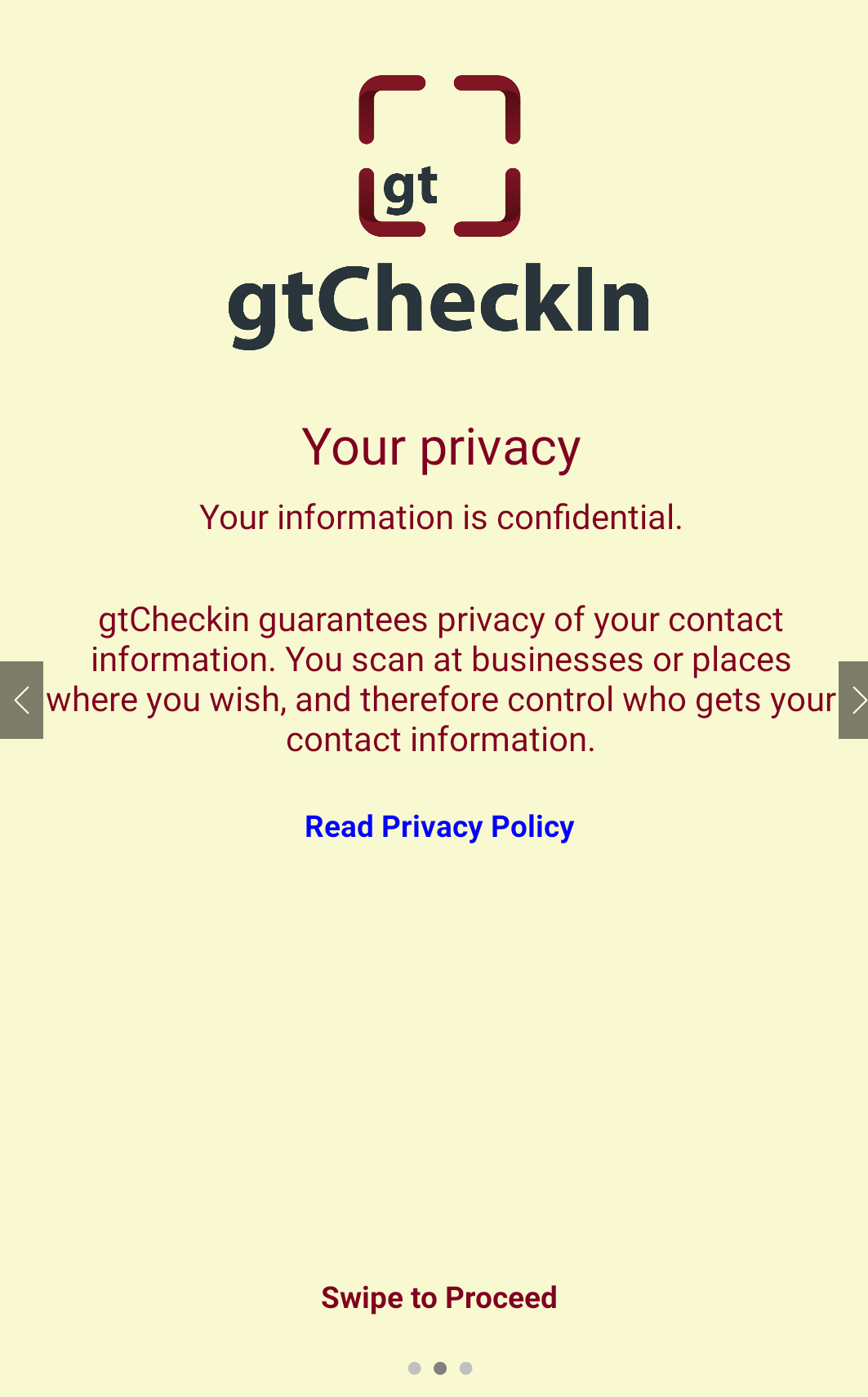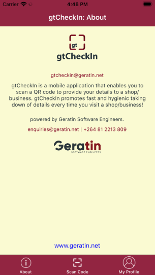 gtCheckin guarantees privacy of your personal information. You scan at businesses or places where you wish, and therefore control who gets your information. To read more about our privacy policy, click here